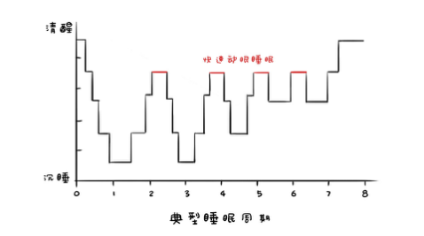 接着需要说一说睡眠节律。睡眠节律分为“小”与“大”两种。小的节律是每次睡觉时的快速动眼睡眠周期,它主要分为三个阶段:非快速动眼睡眠、快速动眼睡眠和觉醒。这三个主要阶段并非依次按顺序出现,而是相互交错。一段健康的睡眠,会出现4至5次三阶段的转换。换句话说,无论醒来时觉得自己睡得多好,夜里其实已经“醒”了好几次。